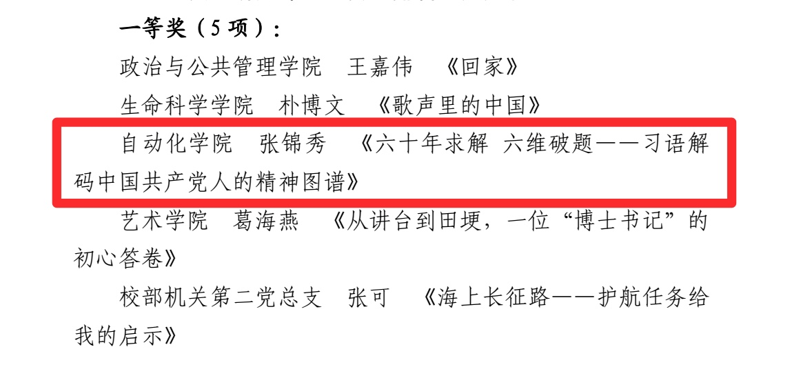 自院学子深入钻研习近平新时代中国特色社会主义思想并踊跃讲述自身理解,深度解码中国共产党的精神图谱,将党建主题与科研精神深度捆绑,阐述出新时代青年的深刻认知。在此向上述获奖人员表示热烈祝贺!希望各位再接再厉,充分发挥示范引领作用,讲好身边党员与支部的先进故事,引导广大党员强化理想信念、筑牢宗旨意识,为推进学校各项事业高质量发展凝聚磅礴力量!